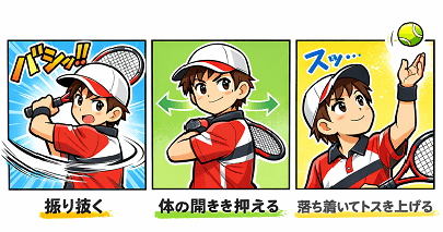 腕だけで打つのではなく、体の回転に合わせてラケットを振ることで安定したスイングになります。